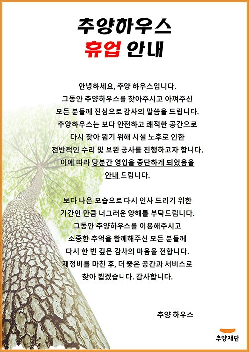 | [Áß¿ä°øÁö] Ãß¾çÇϿ콺 ÈÞ¾÷ ¾È³»... | 2026.02.05 | |
